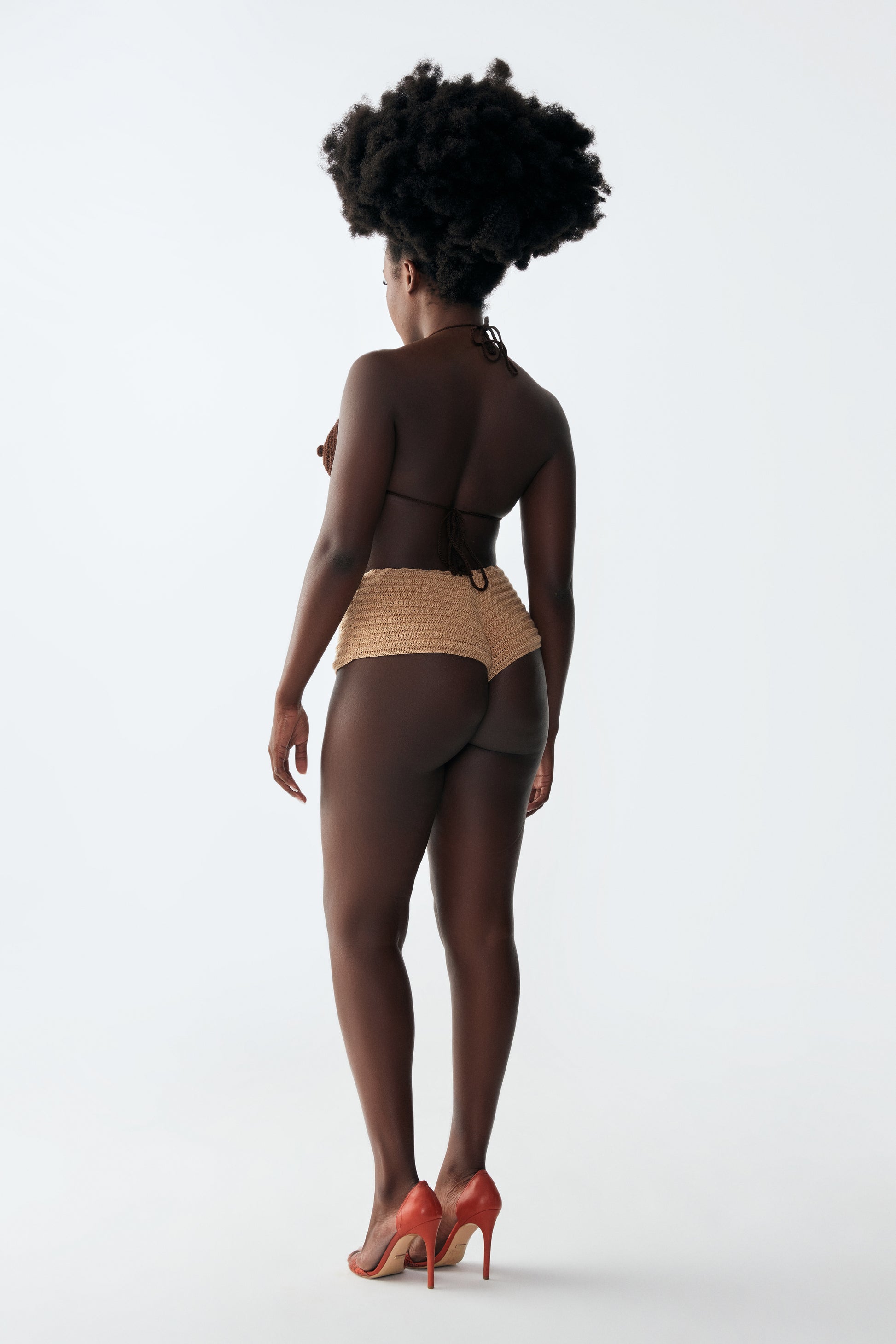 Evoke the spirit of the land with our hand-knitted shorts, a sartorial homage to the rich, earthy tones of ‘the sand’. Their design, rooted in the very essence of terra firma, manifests a deep connection to the landscapes that have inspired them. Each stitch is a labor of love, handcrafted by artisans who have inherited age-old techniques and patterns from their forebears. With a keen eye for detail and a touch of modernity, they transform contemporary designs into woven marvels.