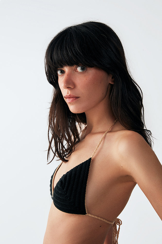 Mu handknitted two-piece bikini set from Spagetti, the perfect addition to your beachwear collection. This set is crafted with the utmost care and attention to detail by skilled artisans, using organic materials to promote sustainable fashion. The bottom piece boasts exquisite details, with lace accents on both sides and a perfect Brazilian cut at the back, giving you a mysterical beauty on the body.