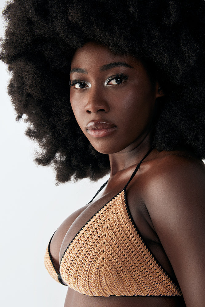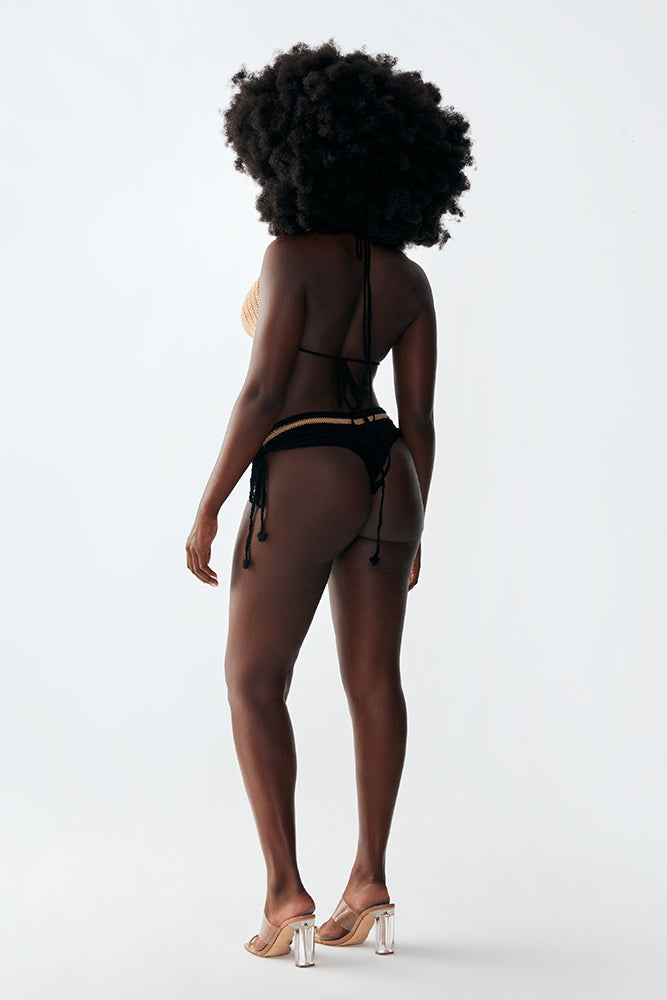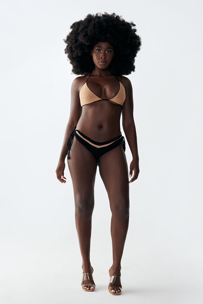 Mu handknitted two-piece bikini set from Spagetti, the perfect addition to your beachwear collection. This set is crafted with the utmost care and attention to detail by skilled artisans, using organic materials to promote sustainable fashion. The bottom piece boasts exquisite details, with lace accents on both sides and a perfect Brazilian cut at the back, giving you a mysterical beauty on the body.