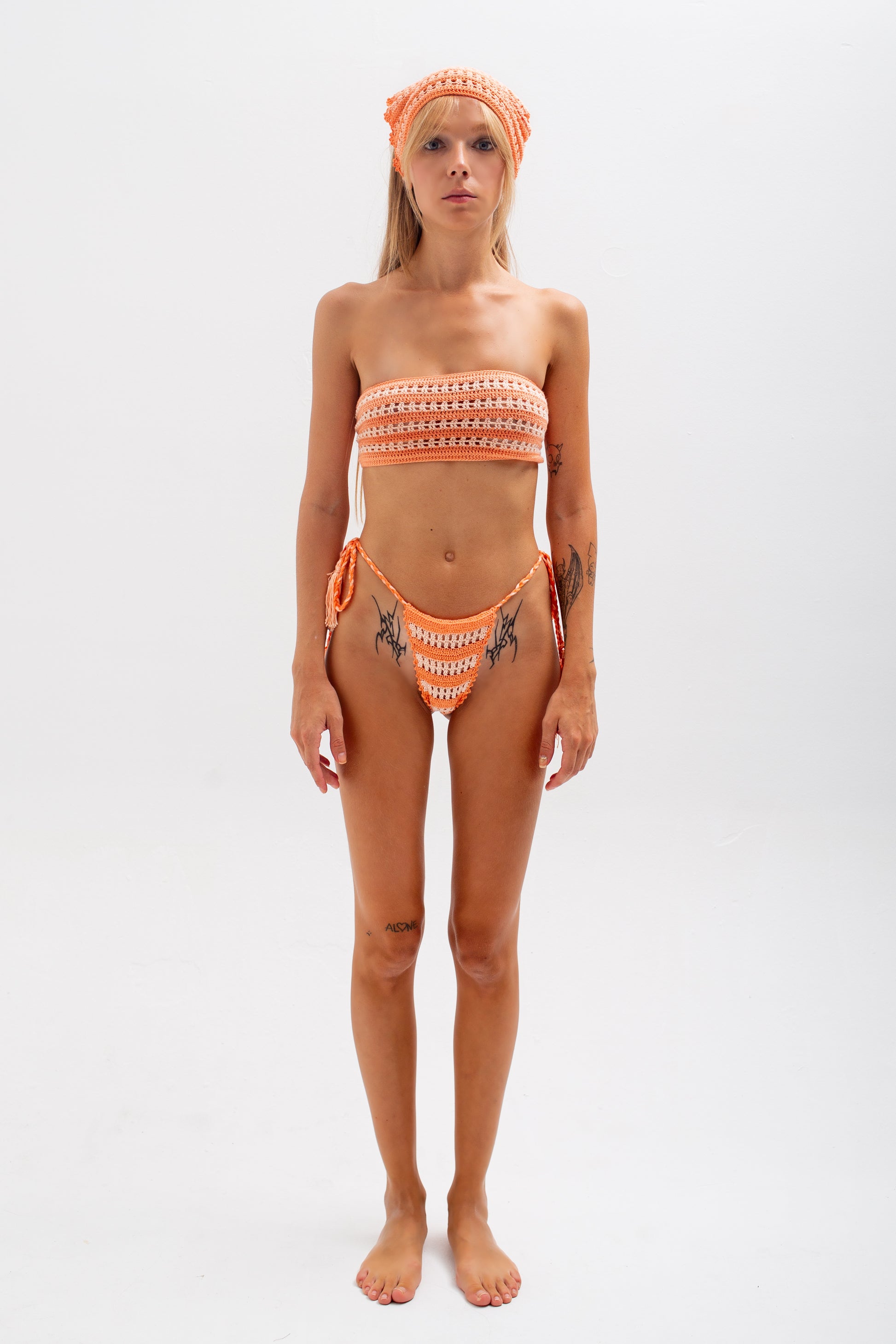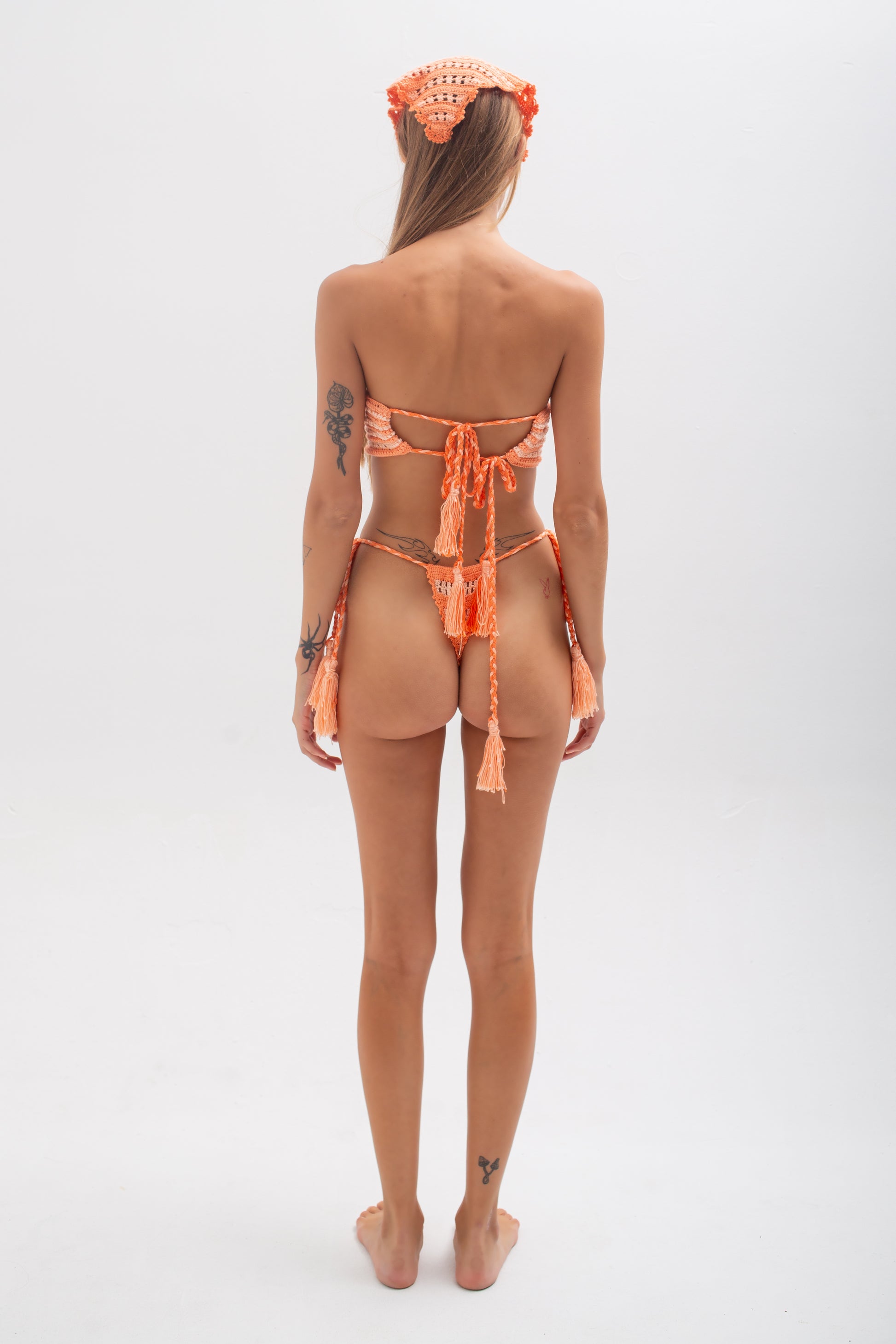 Rosie, a stunning two-piece bikini set from Spagetti that perfectly blends elegance with handcrafted artisanship. The intricate hand-knitted details of this set add a unique touch, making it a standout piece in any beachwear collection. The top piece features web details at the bottom with hand-knitted lace passing through, providing versatility to wear in different styles and ways. The minimal laces make it easy to adjust the top according to the sun’s placement, making it perfect for sunbathing.