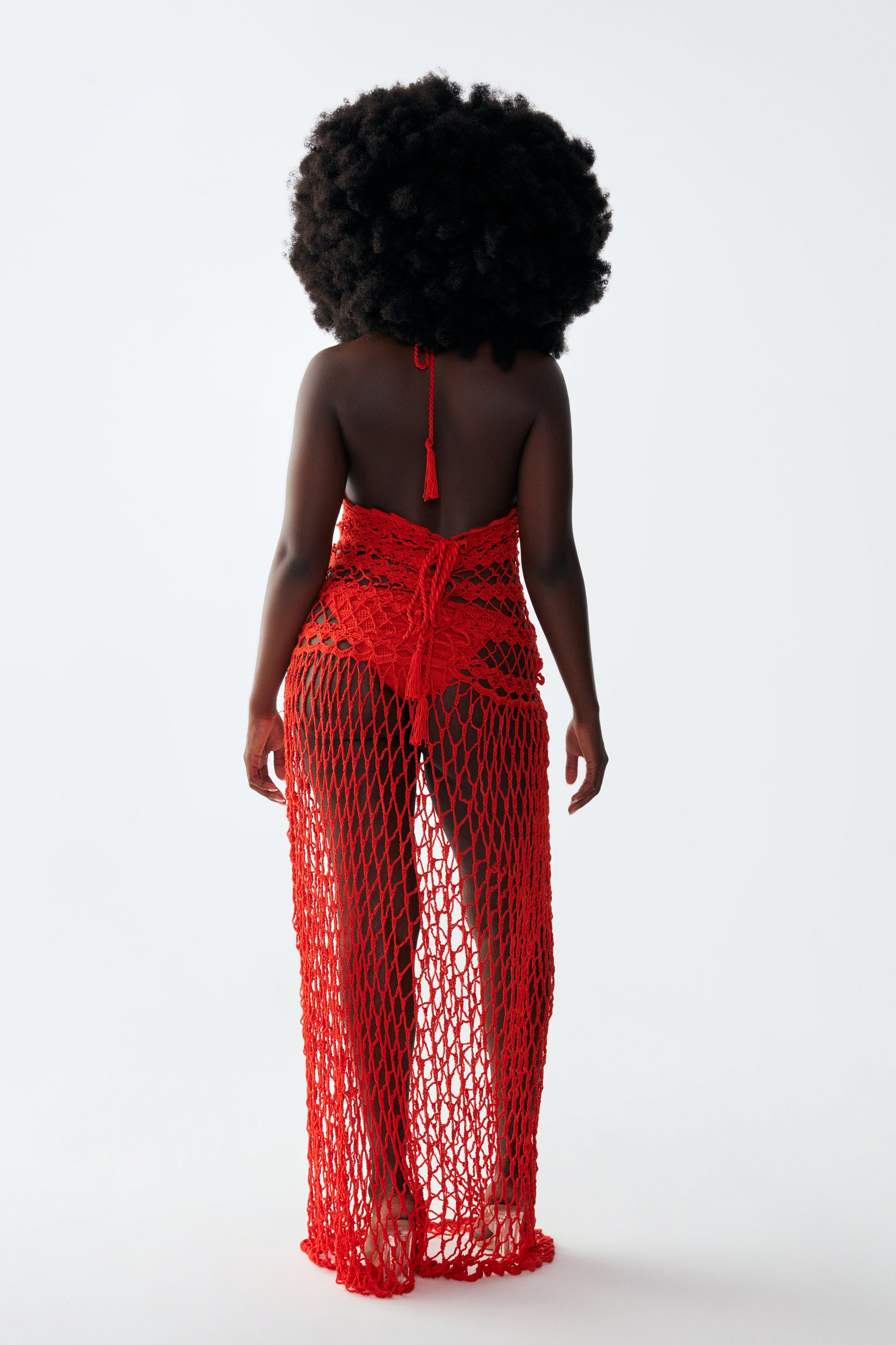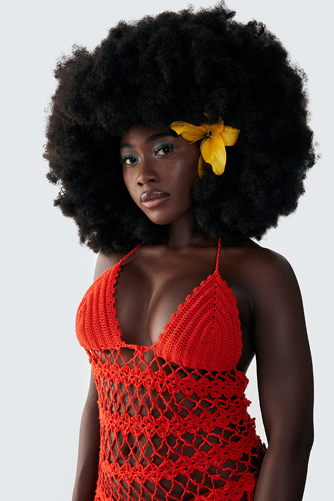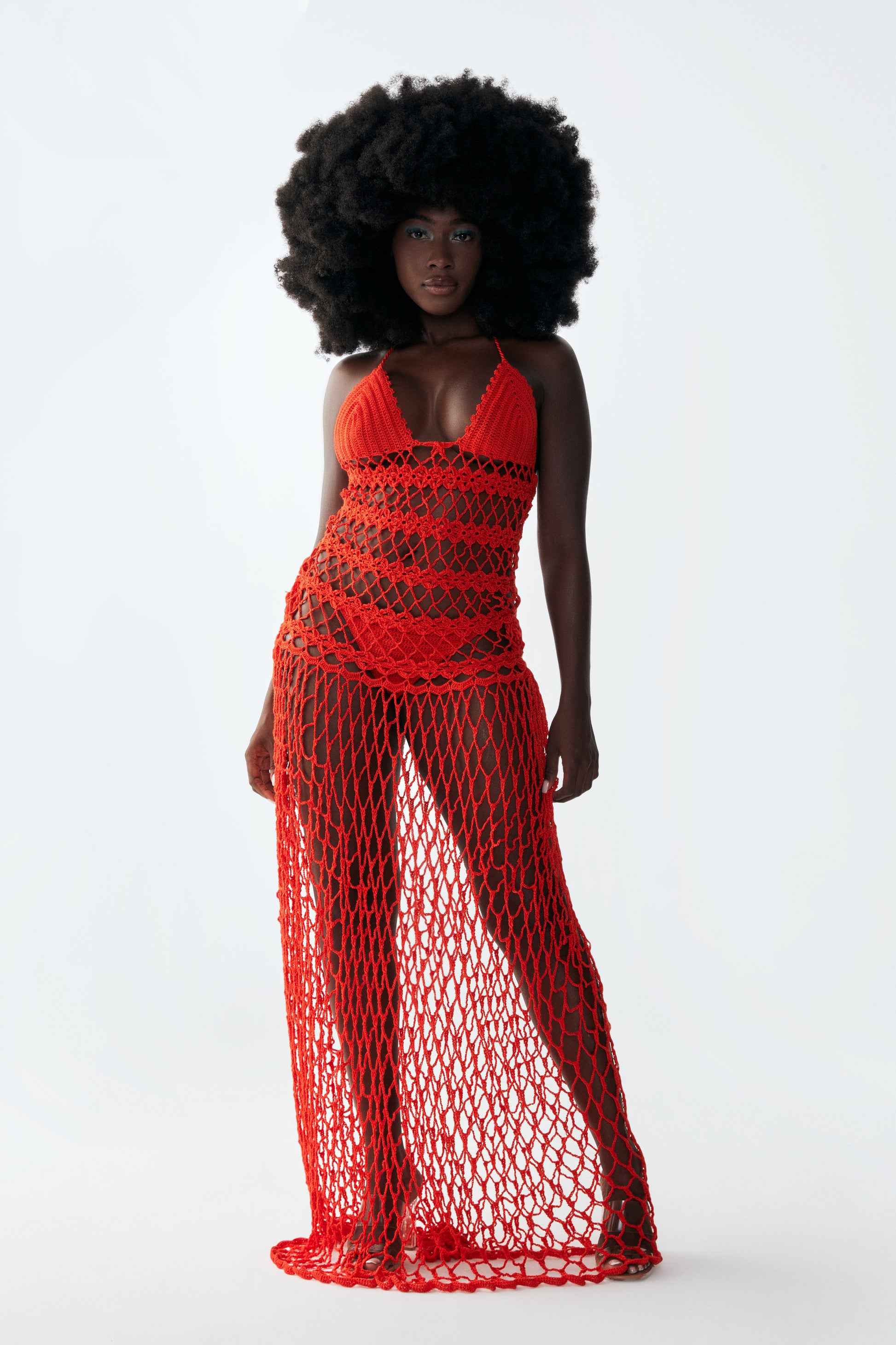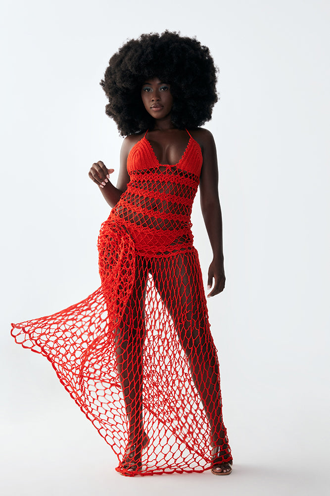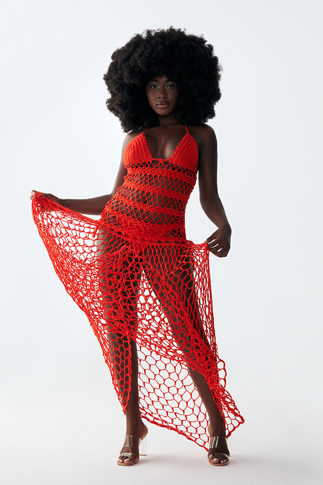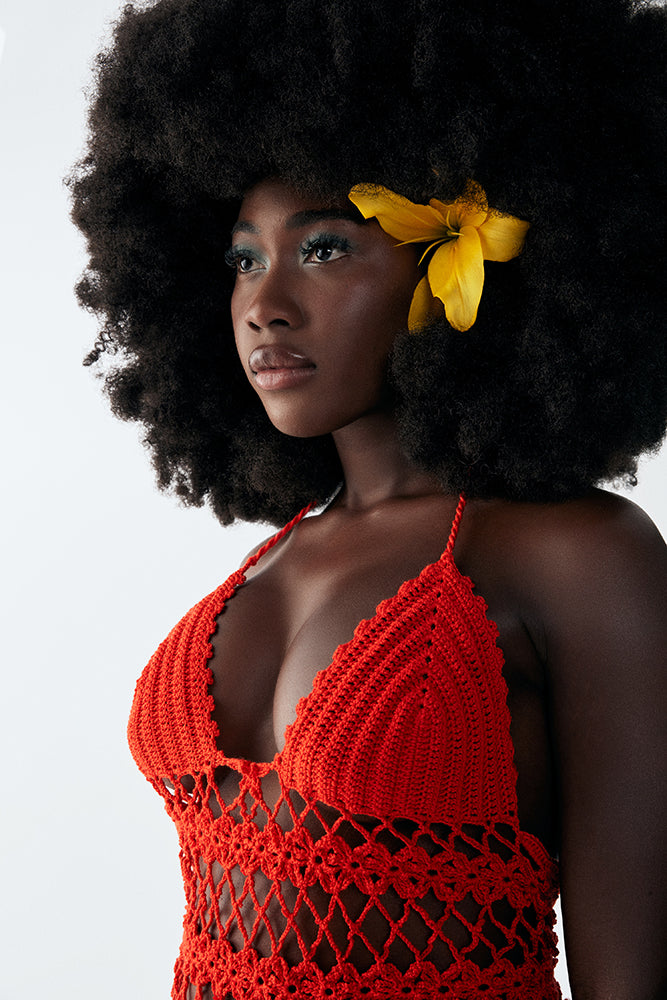 Spagetti Club Dress, a true masterpiece of handcraftmanship and elegance. This versatile dress is perfect for any occasion, whether it’s a casual day at the beach or a night out at a fancy restaurant. The flower detail covering the breast is a complete work of art by our talented knitter artisans, and the see-through details at the skirt add a feminine and joyful touch.