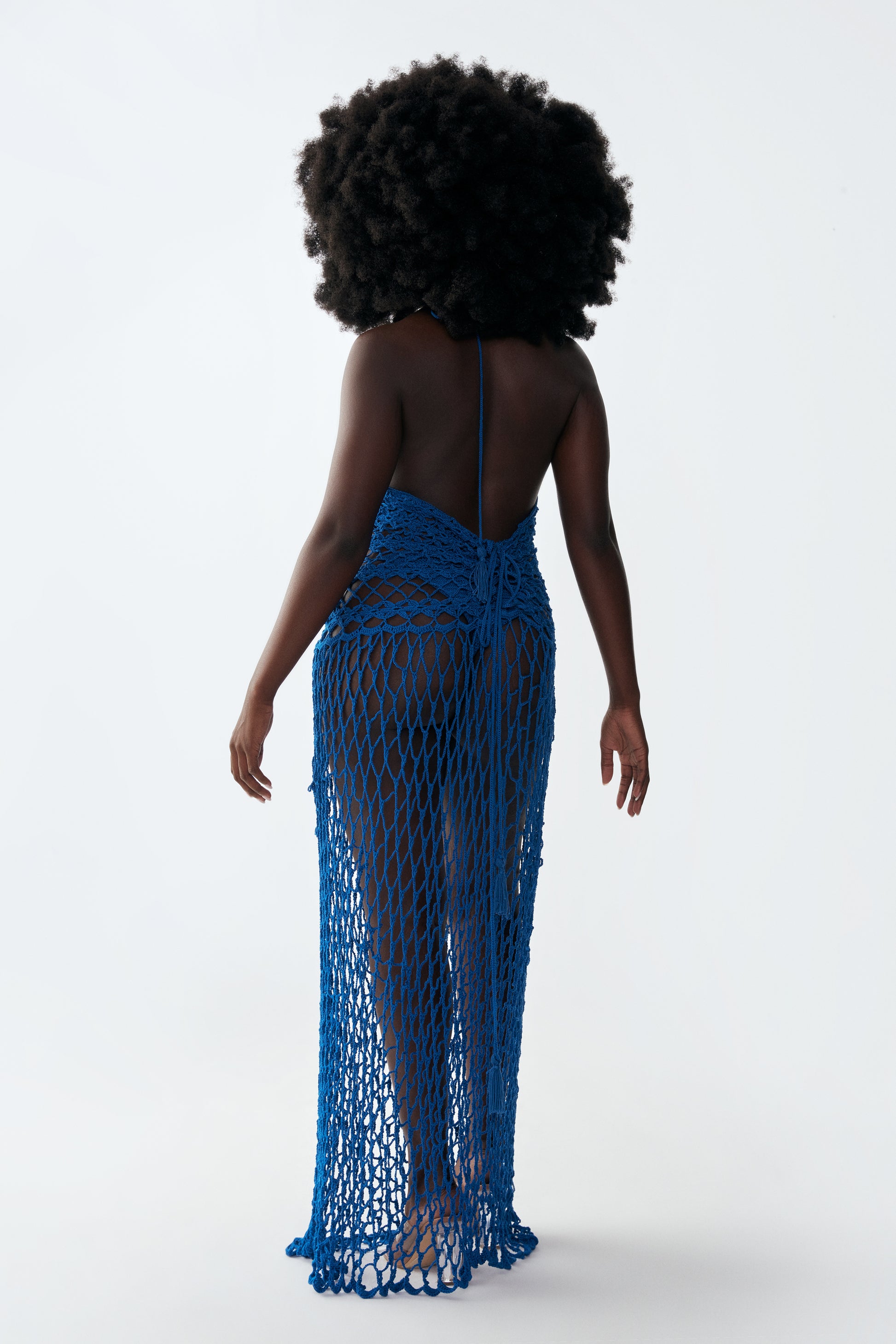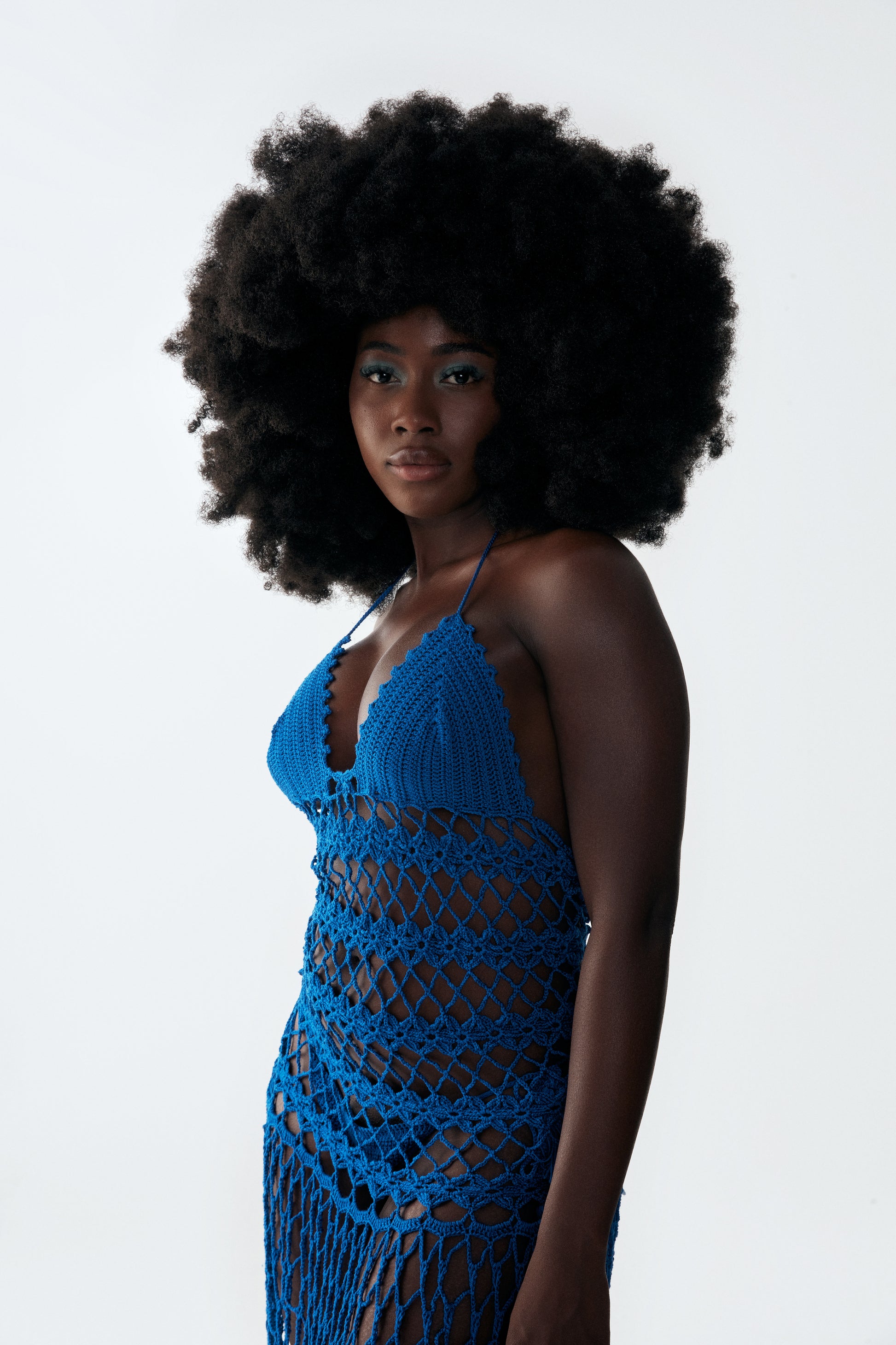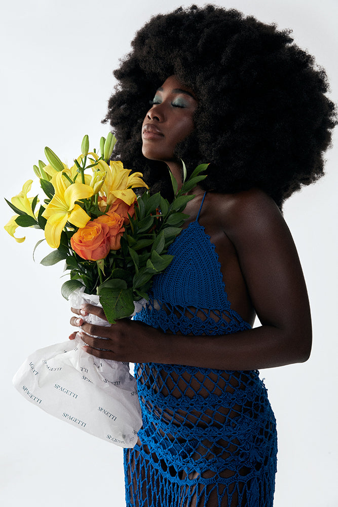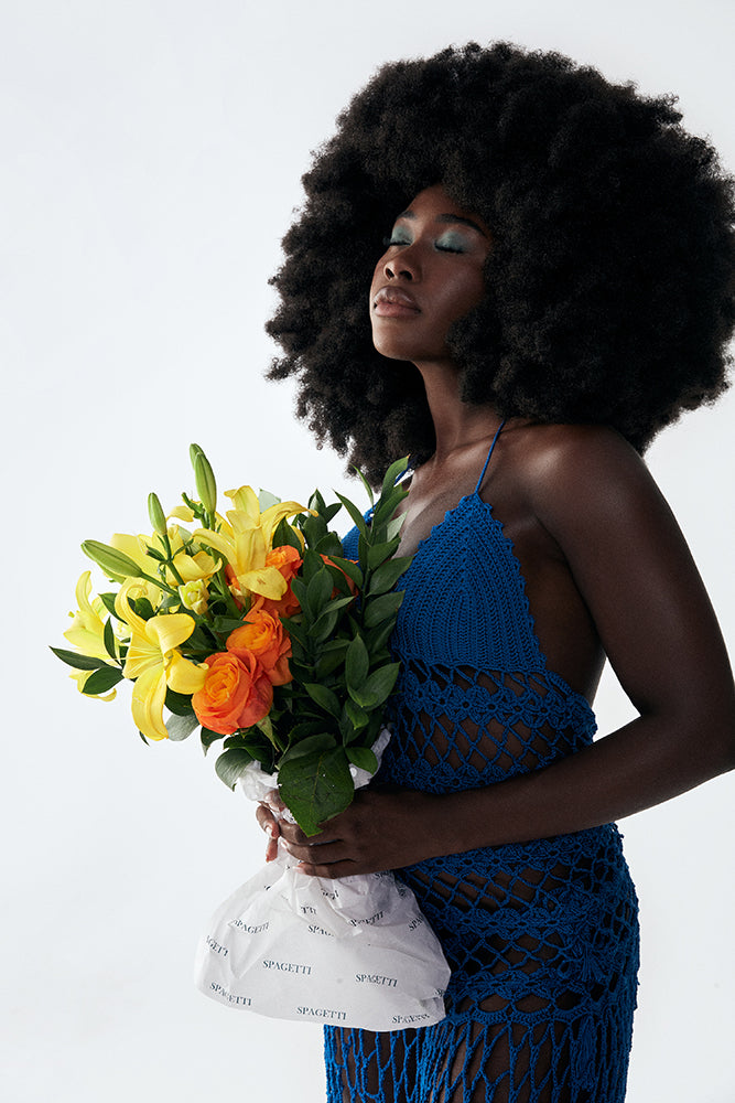 Spagetti Club Dress, a true masterpiece of handcraftmanship and elegance. This versatile dress is perfect for any occasion, whether it’s a casual day at the beach or a night out at a fancy restaurant. The flower detail covering the breast is a complete work of art by our talented knitter artisans, and the see-through details at the skirt add a feminine and joyful touch.
