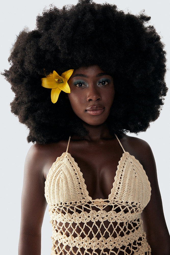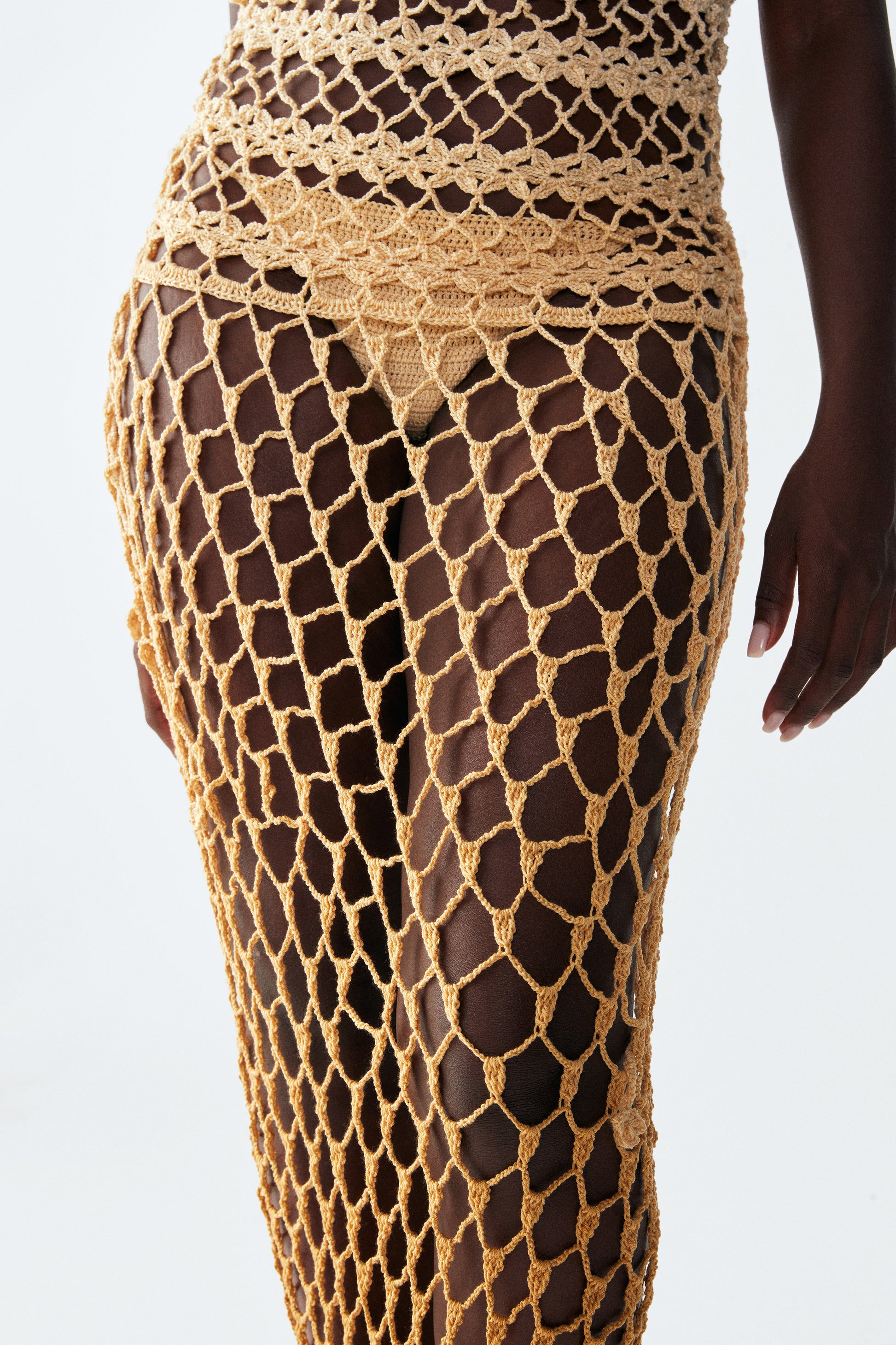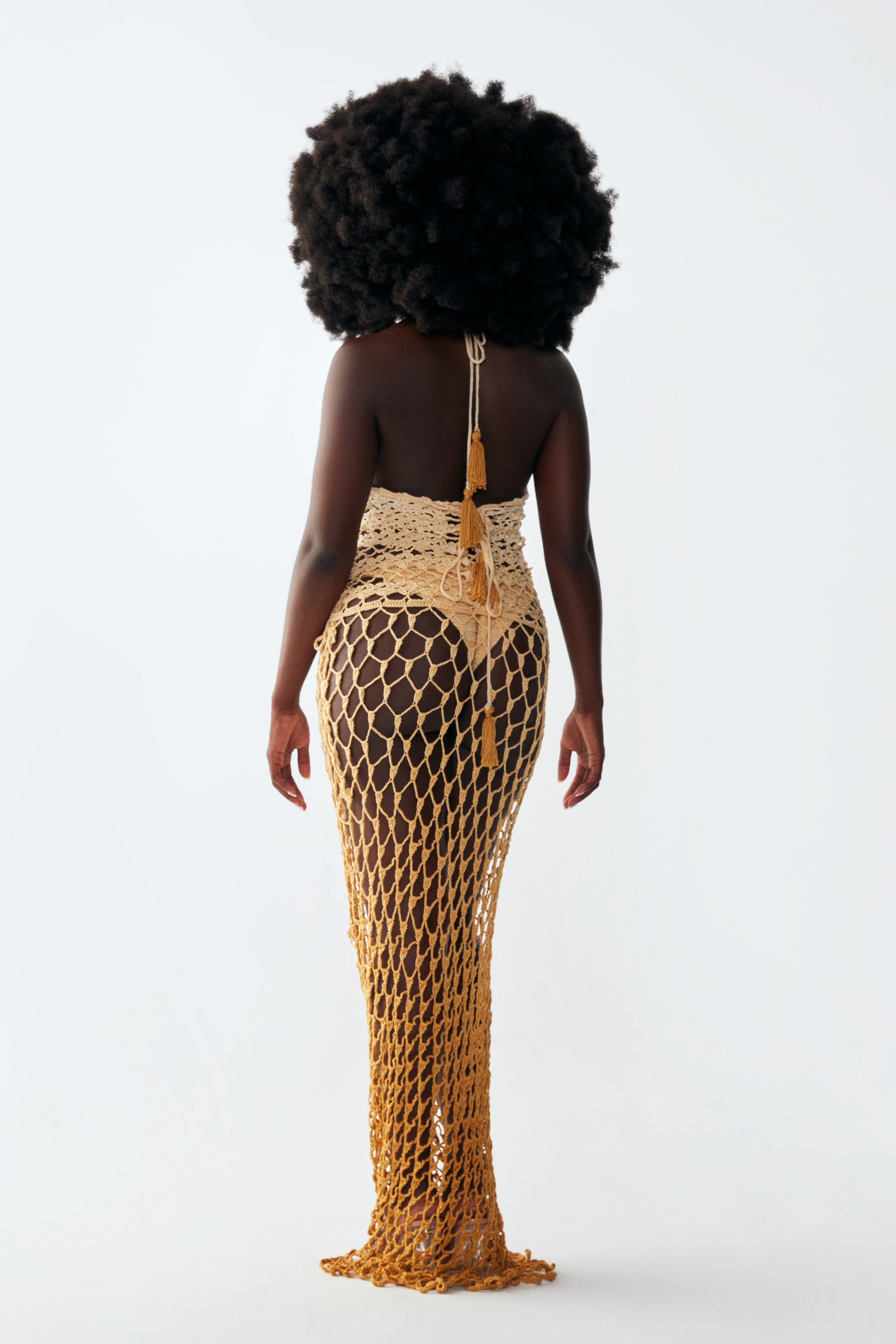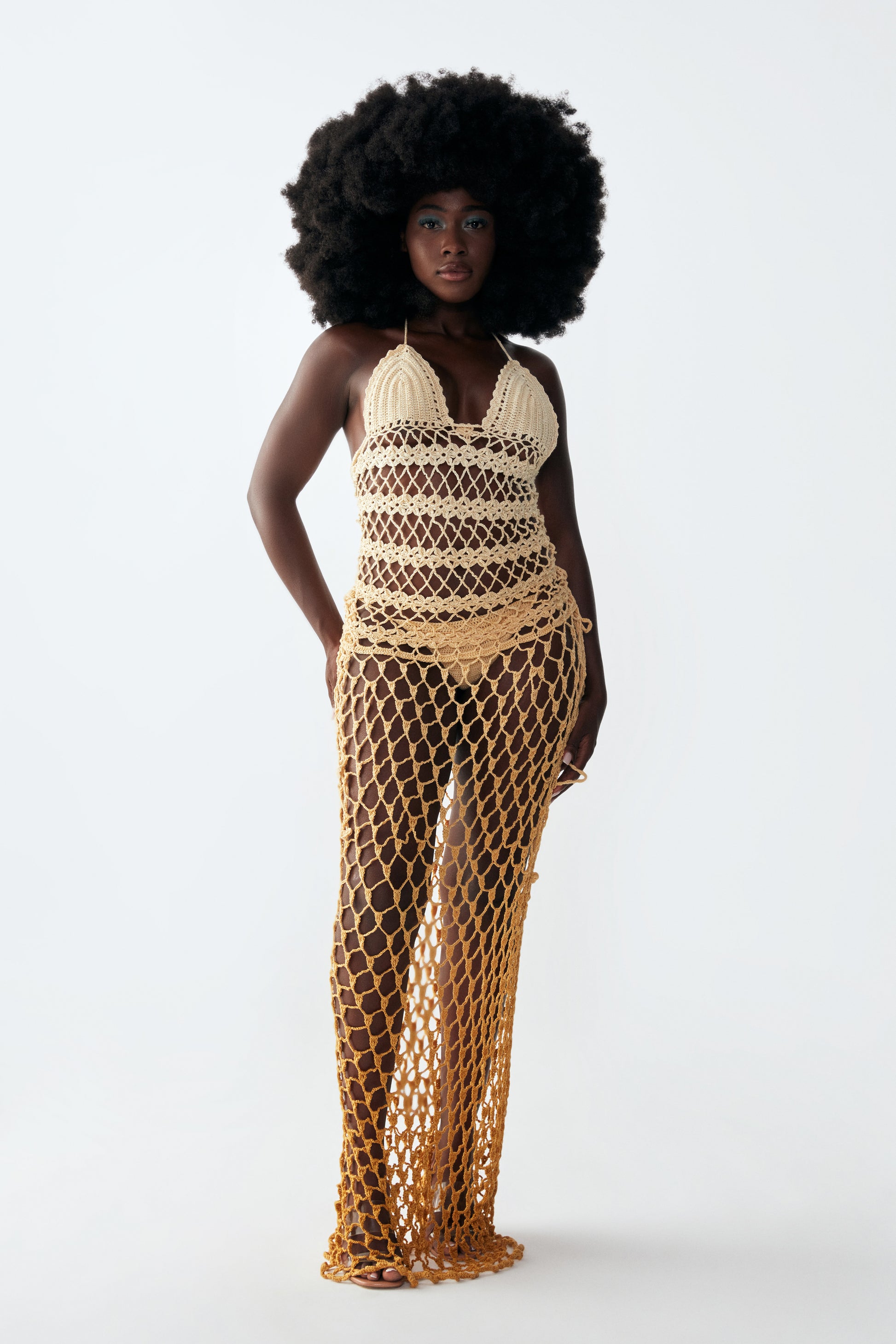 Spagetti Club Dress, a true masterpiece of handcraftmanship and elegance. This versatile dress is perfect for any occasion, whether it’s a casual day at the beach or a night out at a fancy restaurant. The flower detail covering the breast is a complete work of art by our talented knitter artisans, and the see-through details at the skirt add a feminine and joyful touch.