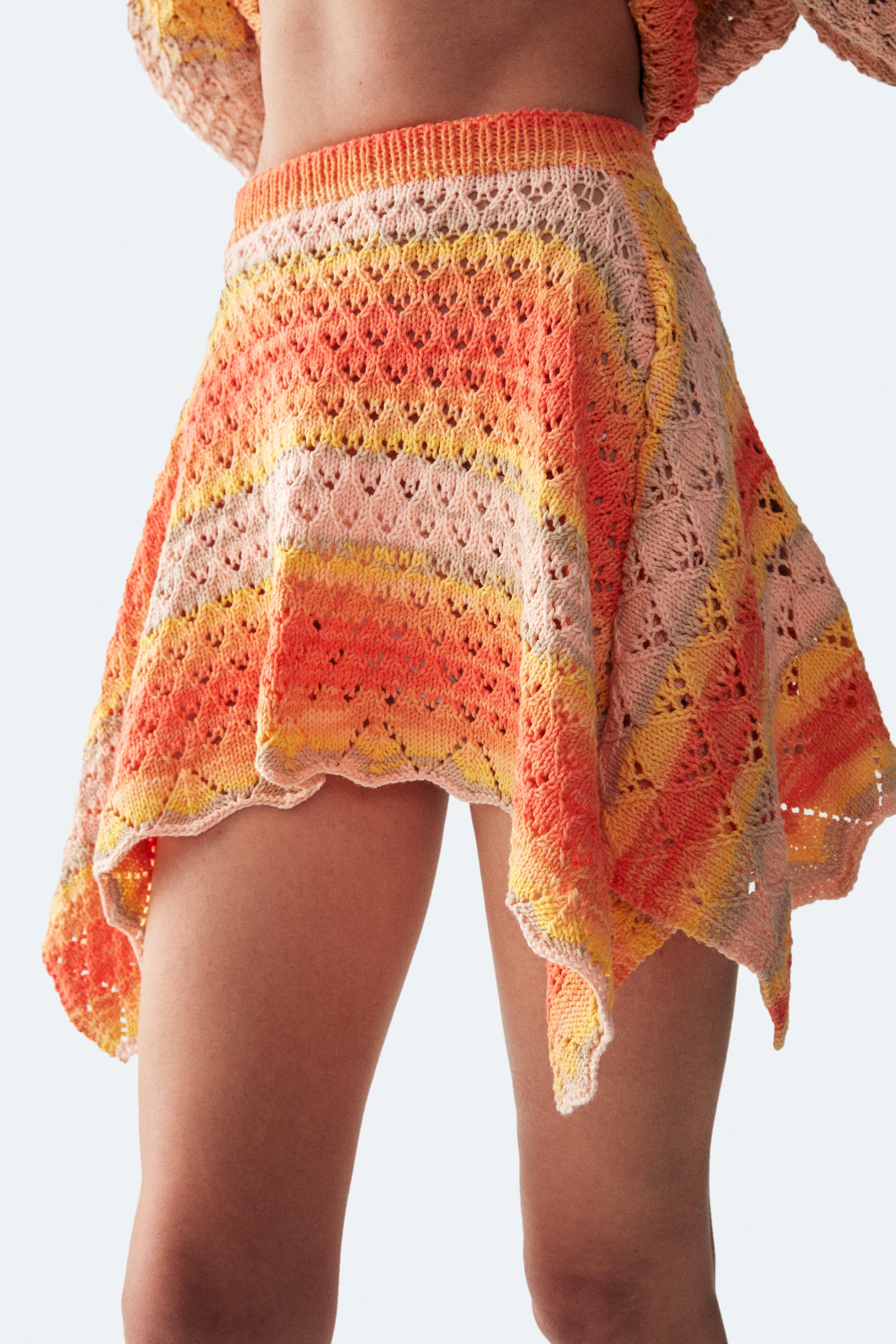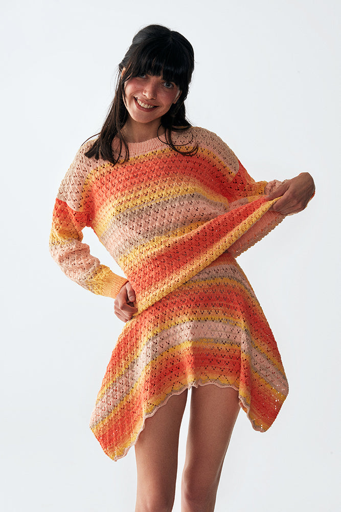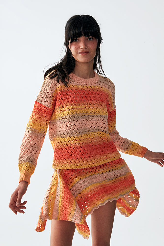 Behold our hand-knitted skirt, a luminous ode to ‘the sunset’ with its myriad of splendid hues. Mirroring the enchanting dance of sunlight as it cascades across our horizon, this skirt captures the poetic moments from golden hour to the deep embrace of twilight. Every stitch is a testament to artistry and passion, a seamless marriage of avant-garde design and age-old techniques cherished by our artisans.