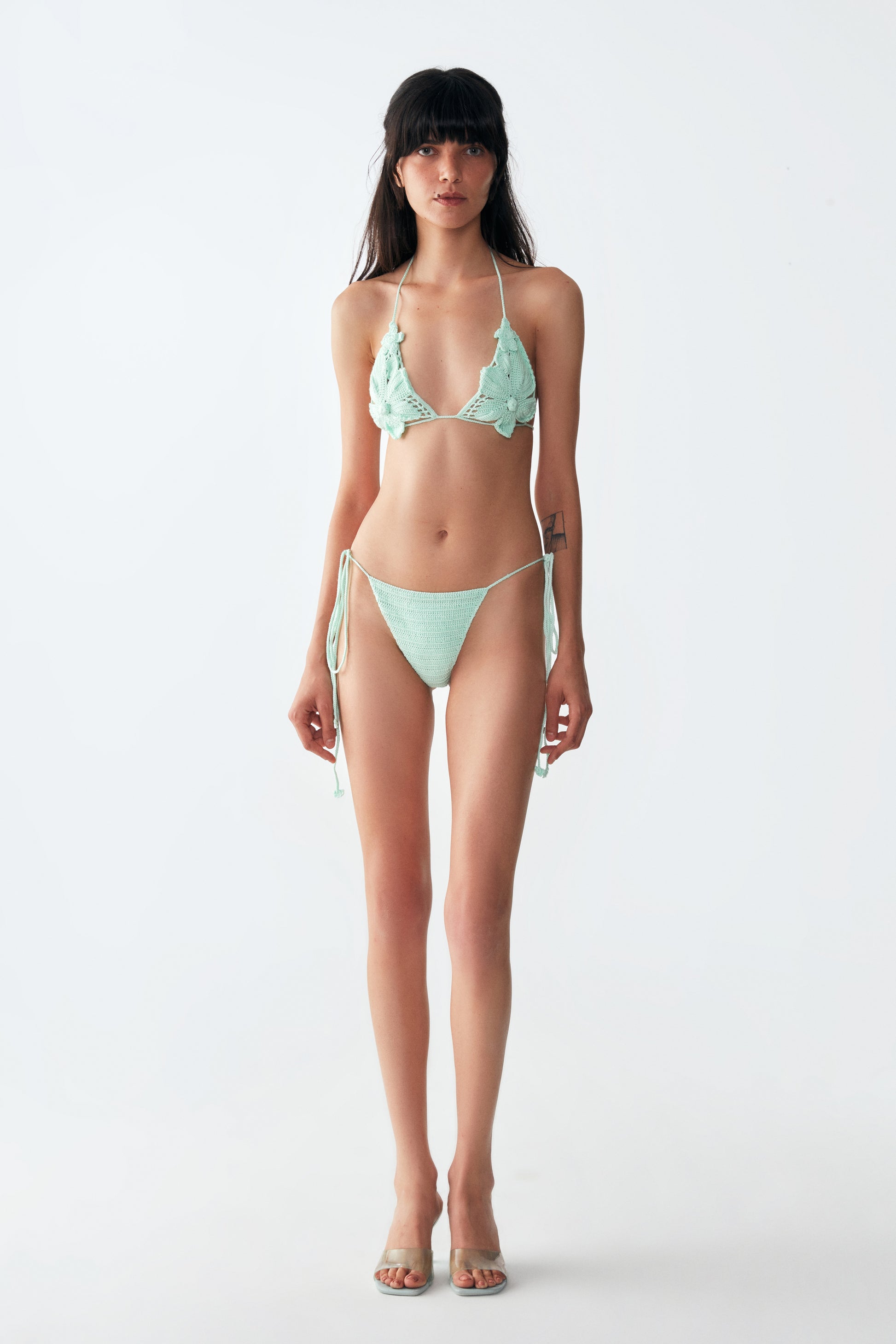 Venus two-piece bikini set by Spagetti, a perfect combination of elegant style and sustainable fashion. Hand-knitted with intricate craftsmanship, this beachwear set features unique details that are sure to turn heads. The minimalist design of this bikini set makes it perfect for sunbathing, while the top piece boasts elegant flower details that cover the breasts in the most elegant and bold way ever.