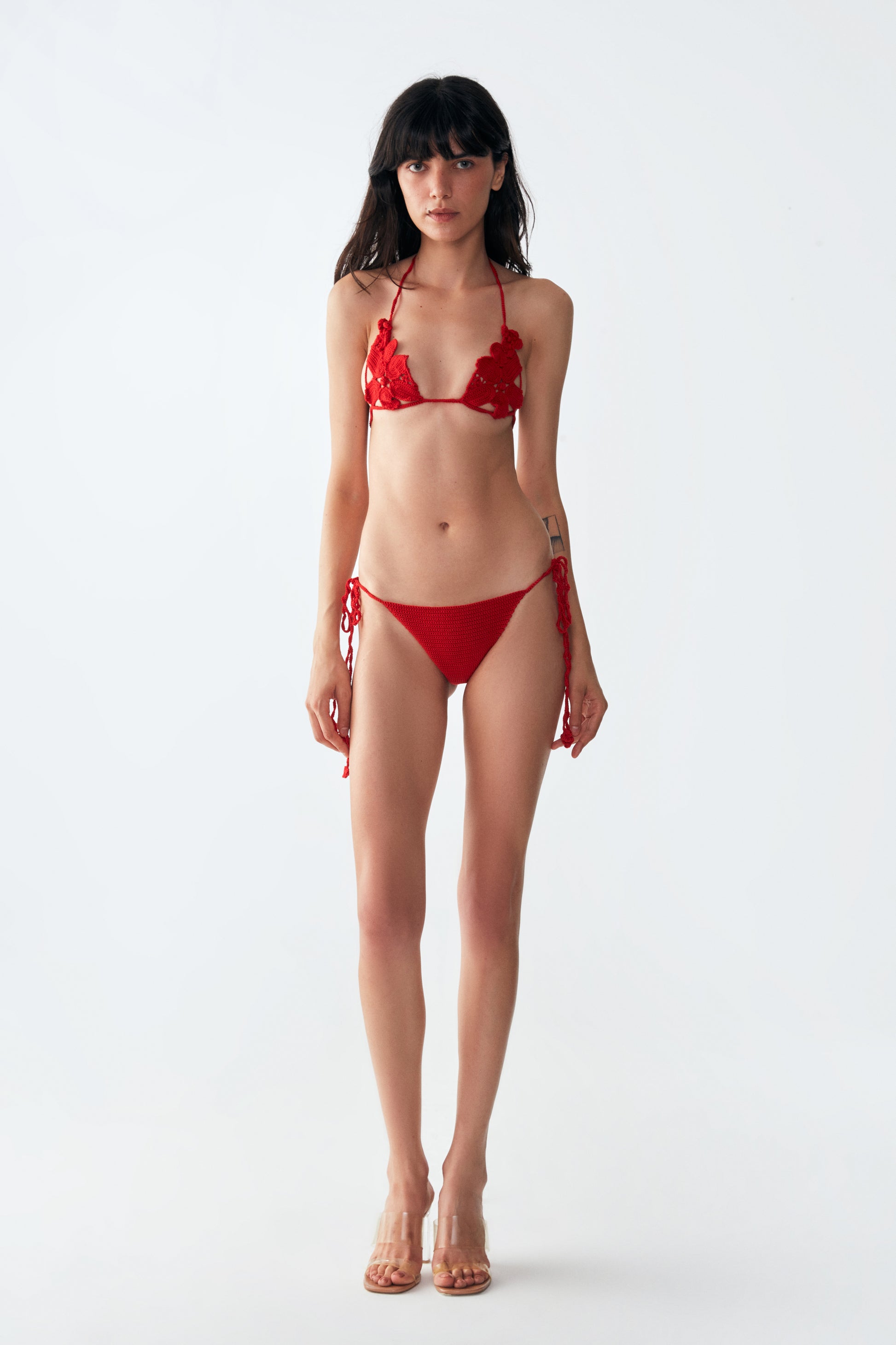 Venus two-piece bikini set by Spagetti, a perfect combination of elegant style and sustainable fashion. Hand-knitted with intricate craftsmanship, this beachwear set features unique details that are sure to turn heads. The minimalist design of this bikini set makes it perfect for sunbathing, while the top piece boasts elegant flower details that cover the breasts in the most elegant and bold way ever.